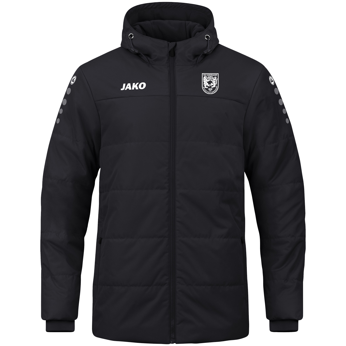 Der Frontbereich ist mit einem robusten Reißverschluss ausgestattet, während die seitlichen Taschen ausreichend Platz für kleine Gegenstände bieten. Die charakteristischen Jako-Logos auf der Brust und den Schultern sowie das Vereinswappen auf der linken Brustseite machen die Jacke zum idealen Begleiter sowohl im Stadion als auch im Alltag. Mit ihrem klassischen Design in Schwarz und weißen Akzenten passt sie perfekt zum Vereinslook des TSV Eintracht Stadtallendorf.
